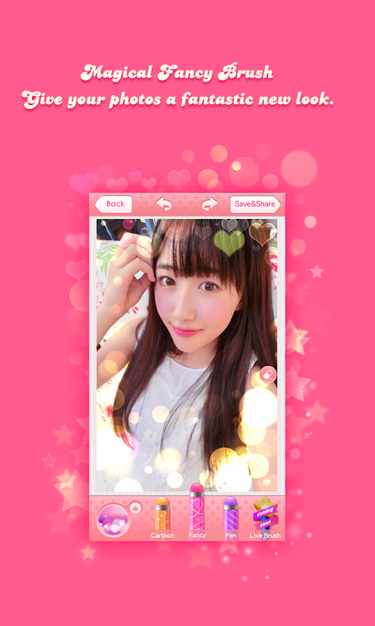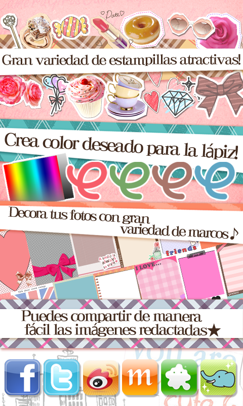 Si te encanta la purikura esta es la app perfecta para ti! tuvo gran exito en asia, tiene variedad de colores para tus textos y puedes escribir tipo manuscrito, contiene estampillas muy lindas, puedes modificar el color de tu foto, tiene marcos y una brocha para cambiar el fondo de tu foto! entre mas cosas